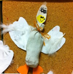 Az elsőhöz kell egy kimustrált fehér zokni, madzag, karton, filctoll, tömőanyag, ragasztó és néhány fehér toll. Ki kell vágni a kartonból a libaformát, kifesteni az arcát, ráragasztani a tollakat és a kitömött zoknit, aminek bekötöttük a végét. Kész is.