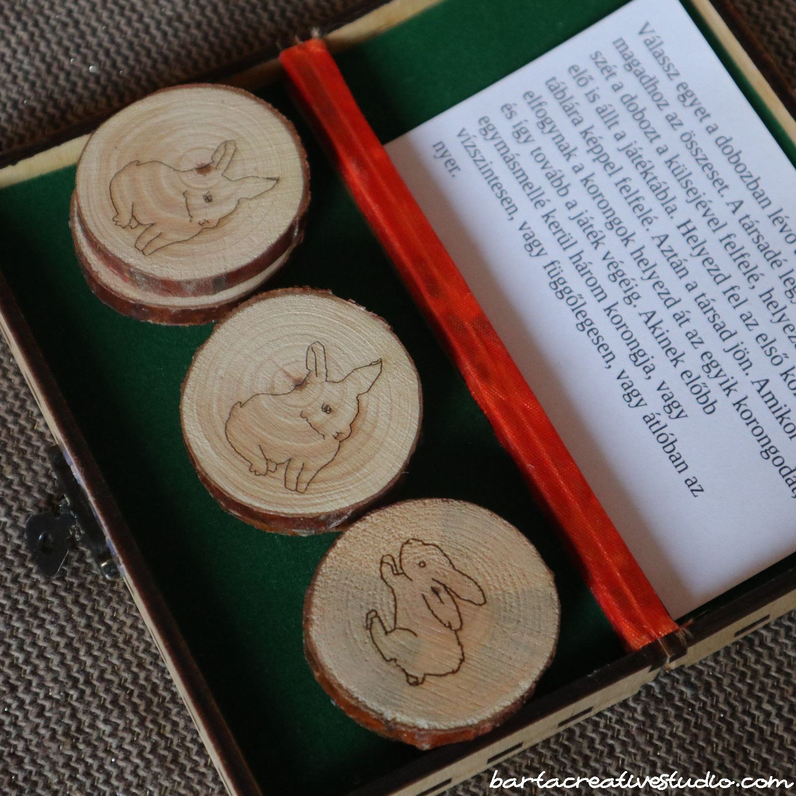 A "Sorakozó!" című játékunk a Tik tak toe játékhoz hasonlít. Ezt a játékot kicsit nagyobb gyerekeknek ajánlom. Hat éves kórtól már bátran játszhat vele a gyerkőc. Állatos figurákból választhatunk a játékhoz. Van a készleteinkben dínós, unikornisos, kutyás, cicás és egyéb mintákban is gravírozott korong. A kézműves vásárokon nagyon kedvelték a vevőim, hogy összeválogathatták a nekik legkedvesebb állatokat a saját megvásárolt játéktáblájukhoz. Az egyik legkedveltebb játék a vevőim között. Egy gravírozott fadobozba van csomagolva a játék. Ebben van benne a hat korong és a játékszabály. A fadobozt kifordítva áll össze a játéktábla. Három-három koronggal rendelkezik mindkét játékos. Rak az egyik játékos, aztán a másik úgy, hogy három korong összegyűljön neki egymás mellett, vagy vízszintesen, vagy függőlegesen, vagy shréhen. Hogyha lerakták a korongokat, de még senki sem nyert, a következő játékos veszi fel az egyik korongját, és áthelyezi a táblán máshova. Addig folytatódik a játék, amíg nem gyűlik össze valakinek a három korongja a megadott lehetőségek közül valamelyik módon.